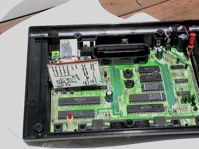 And below is a shot of the completed board sitting in the 7800. The wires on the left are the outputs running up to the connectors I placed on the left hand side of the console. Placement of the connectors was tricky, I had to leave room on the outside for RCA plugs with a thick insulating boot around them, as well as room for fingers to grip the plugs while plugging them in and pulling them out.