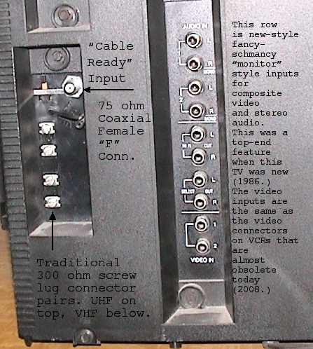 Above is a picture of a TV from the late 1970s. There are two sets of antenna screws, one pair for VHF (channels 2-13), one pair for UHF (the higher numbered channels) and a pair that act as a jumper to select an external or internal antenna. The internal antenna worked fine, so long as your favorite TV station had their transmitter tower in the middle of your living room.