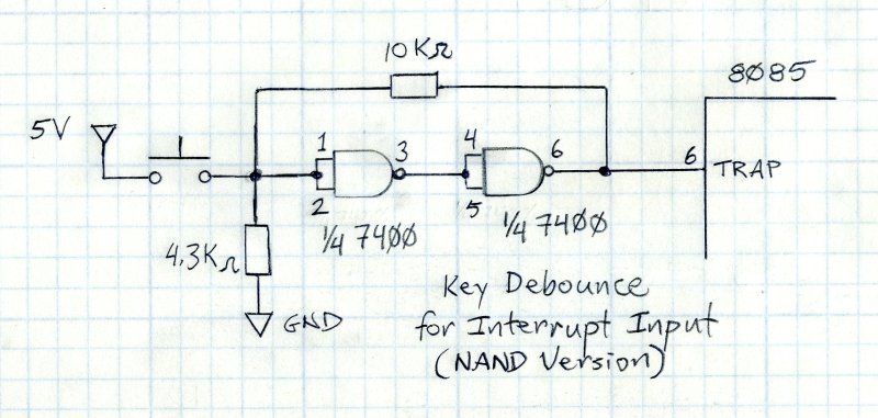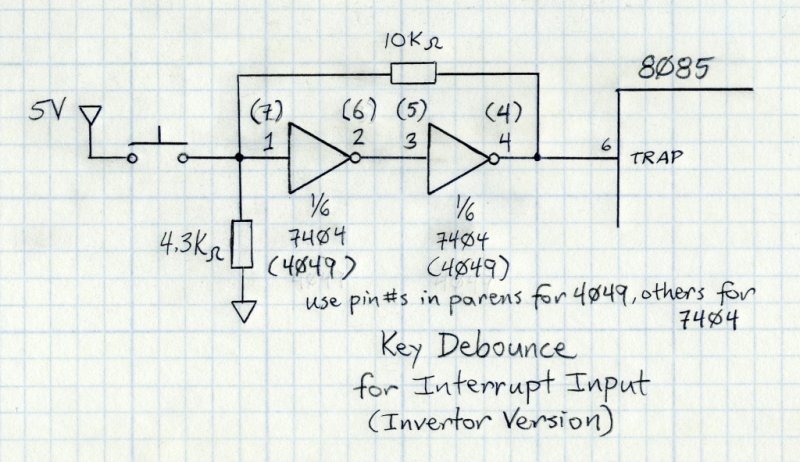 The TRAP input is what's called a "non-maskable interrupt." That means there's no way for the computer to ignore it. Most other interrupts can be ignored. The RST5.5, RST6.5, and RST7.5 interrupts are ignored by default (this makes the 8085 more compatible with software for the 8080A.) Rather than using an interrupt that we need to write software to enable for our initial interrupt test, we'll use TRAP so that we can avoid the extra trouble.