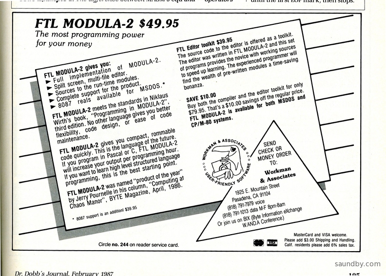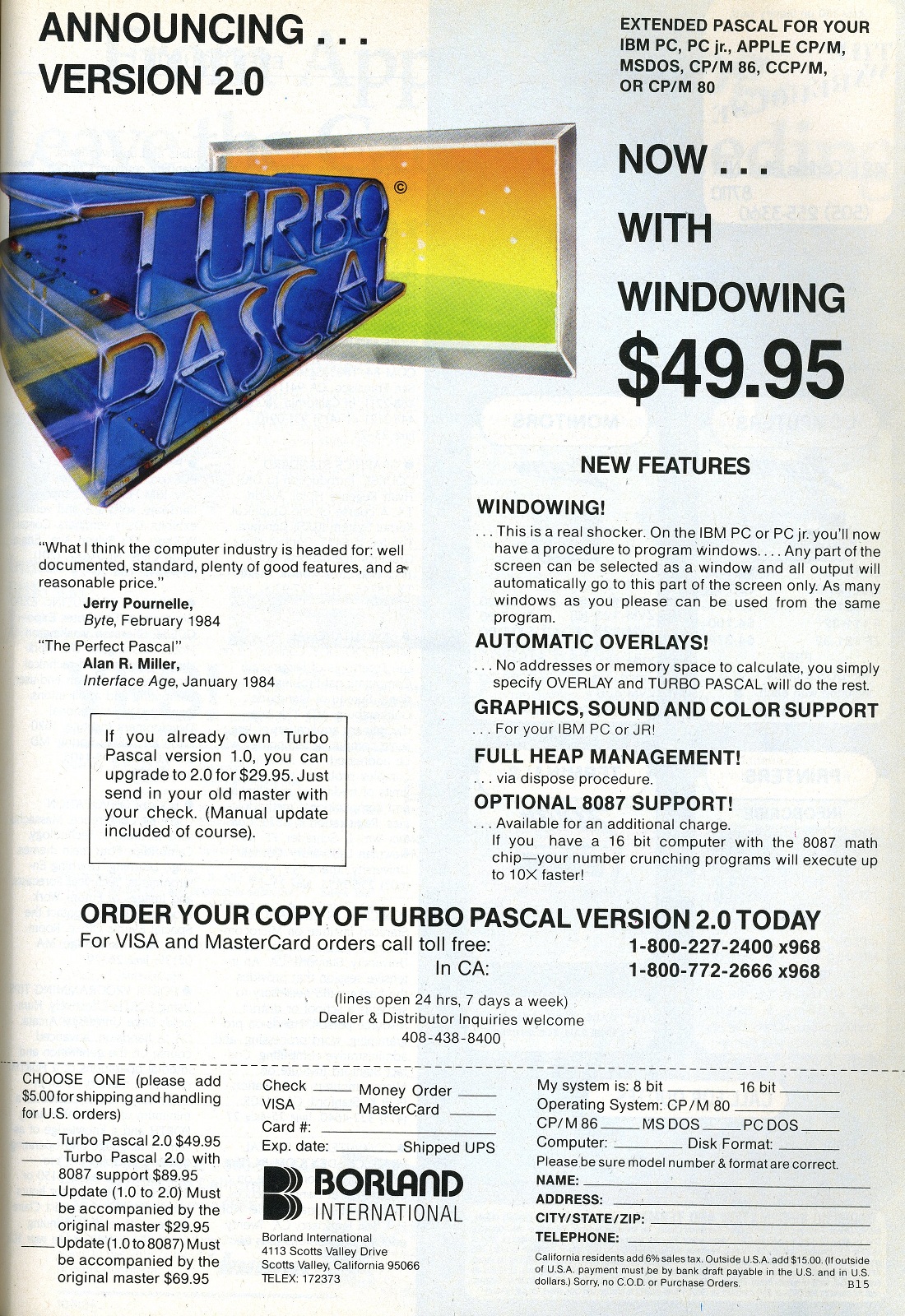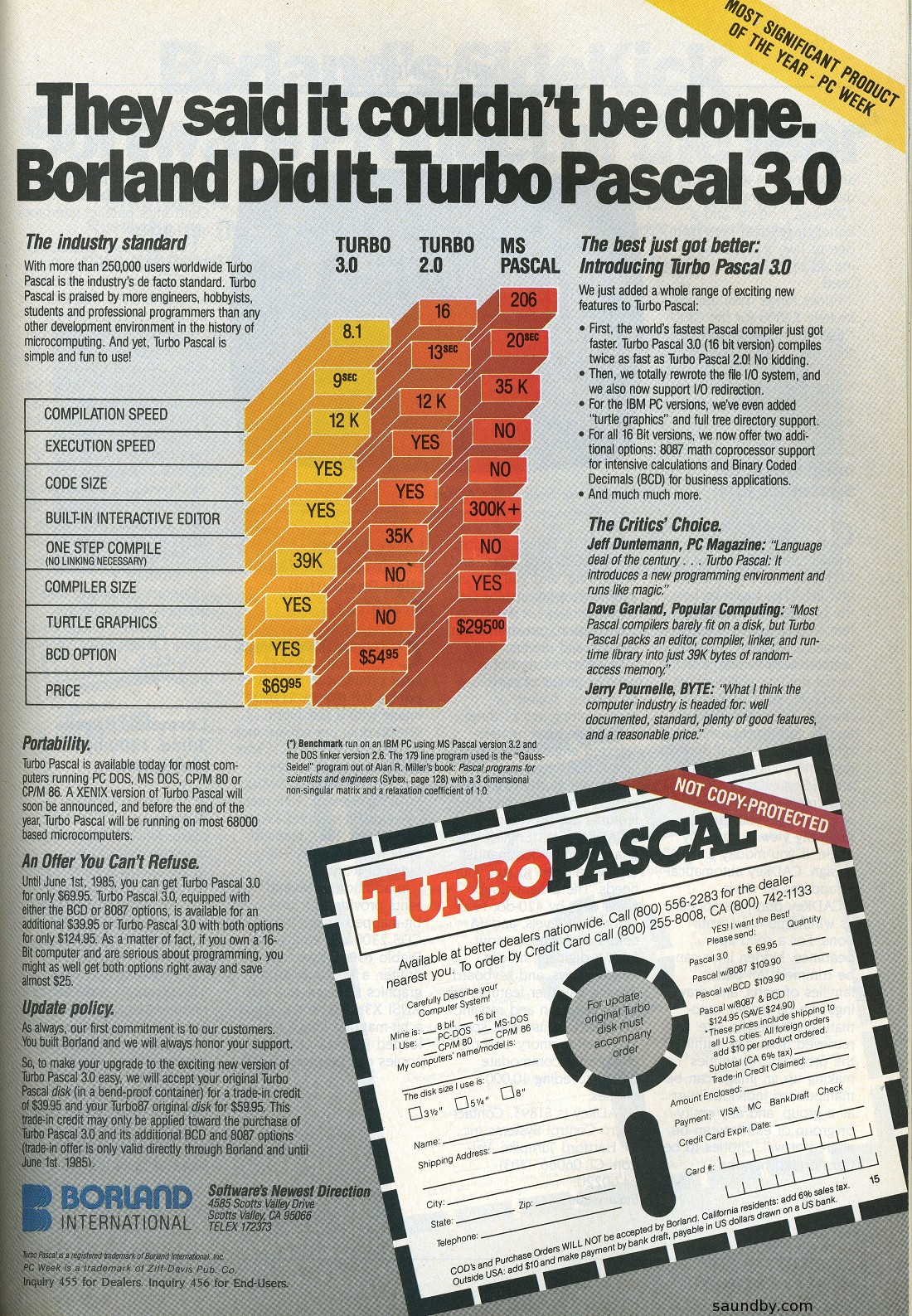 I'm running Turbo Pascal 3.0 right now. This compiler was pretty exciting in its day. I've done enough work in it (versions 2.0 through 4.0) over the years that it's pretty well second nature to me. I like version 3 quite a lot, though on a PC I think 4.0 is a little bit better than 3.0. Here are a couple of the ads that got us so excited about Turbo Pascal back when.